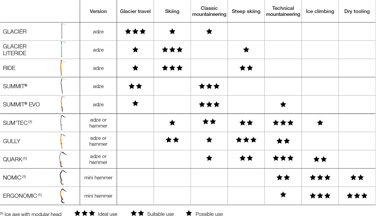 Performance ice axes with forged head and excellent anchoring qualities adapted to the multitude of configurations of alpine terrain. However personal preference and the slopes you expect to typically encounter may shorten the length. Performance models for difficult snow ice and mixed climbs. Long ice axes will get in the way of both of these things.